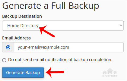 After the cPanel backup is finished, you will receive a notification. You can download backups from Backup > Download a Full Account Backup.