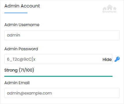 • Admin Username: Your new Subrion username (for security reasons, do not use the administrator or the admin username).